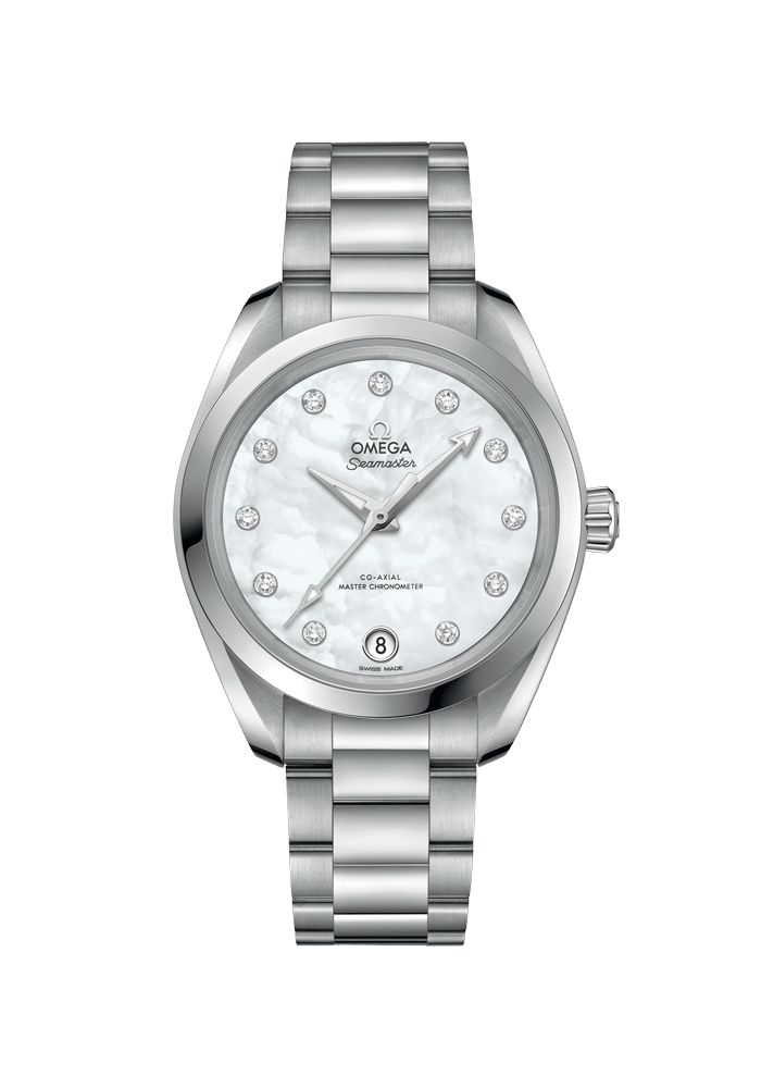 Dieses Modell mit einem symmetrischen 34-mm-Gehäuse aus Edelstahl verfügt über ein weißes Perlmuttzifferblatt mit einem Datumsfenster bei 6 Uhr und 11 diamantbesetzten Indizes in rhodinierten Fassungen.