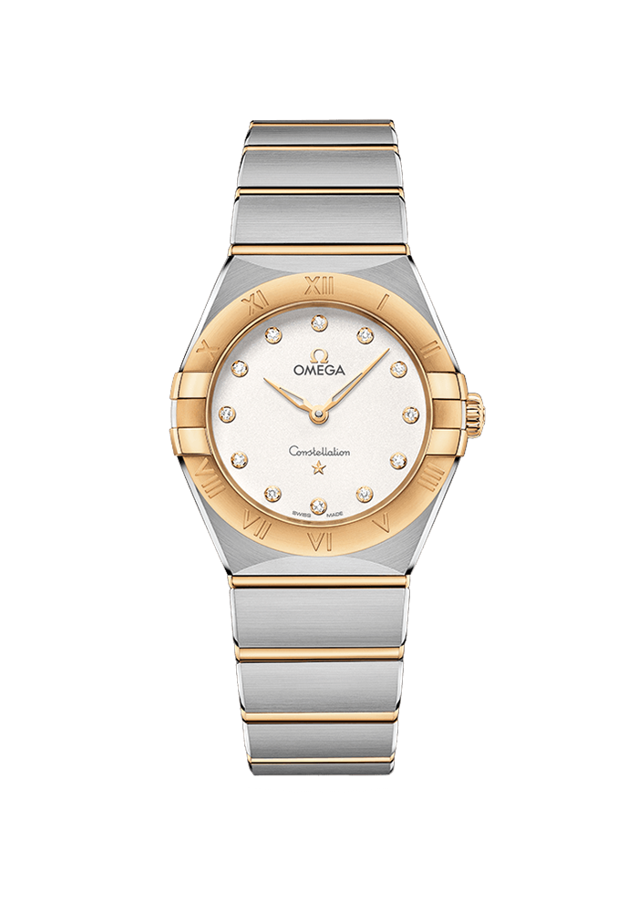 | Zifferblatt | weiß, mit Diamanten besetzt, Diamantfassungen, Zeiger, Omega-Logo und Constellation-Stern aus 18 Kt Gelbgold |