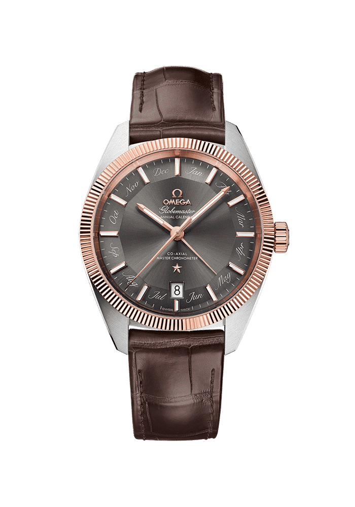 Die Uhr ist mit einem braunen Lederarmband ausgestattet und wird von OMEGAs Co-Axial Master Chronometer Annual Calendar-Kaliber 8922 mit revolutionärer antimagnetischer Technologie angetrieben.