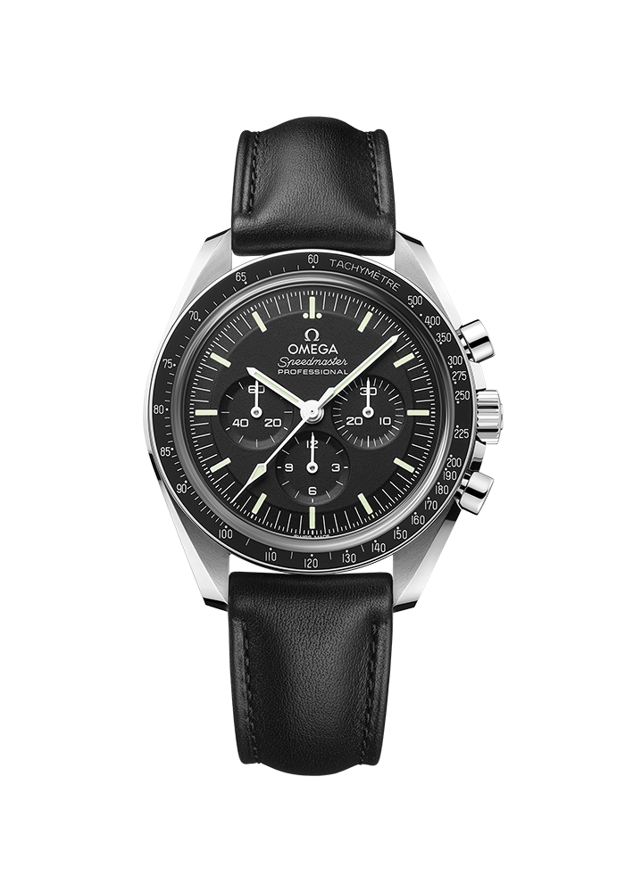 Diese 42-mm-Moonwatch aus Edelstahl wird von einem schwarzen Lederarmband am Handgelenk gehalten. Als Uhrglas und Gehäuseboden dient Saphirglas. Inspiriert von der 4. Generation der Speedmaster, die auf dem Mond getragen wurde, besitzt das Modell auch ein asymmetrisches Gehäuse mit appliziertem OMEGA Logo, ein schwarz abgestuftes Zifferblatt und den berühmten Punkt über der 90 auf dem Lünettenring aus eloxiertem Aluminium.