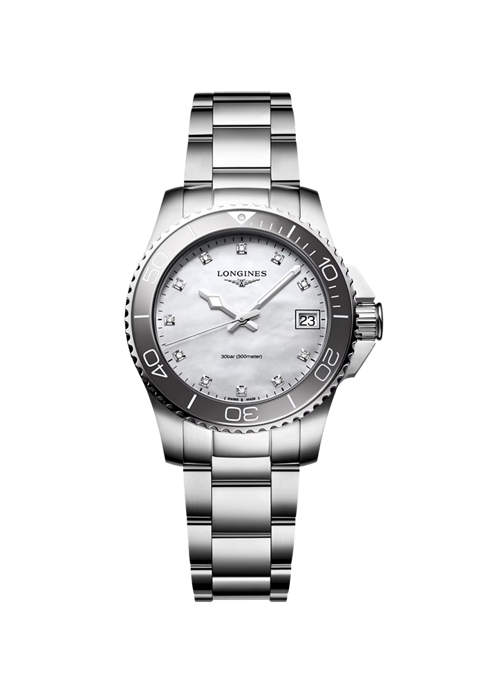 Zifferblattweißes Perlmutt, mit 11 Diamanten (Top Wesselton VS-SI) mit einem Gesamtgewicht von 0.044 Karat besetzt
