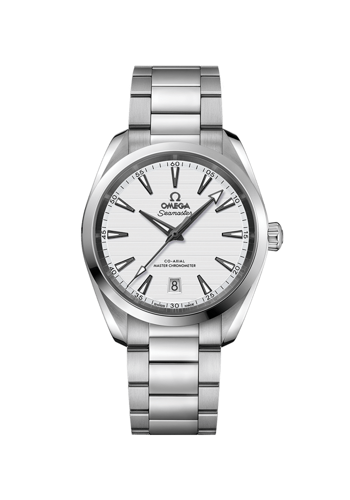 Die Seamaster Aqua Terra ist ein Tribut an OMEGAs großes maritimes Erbe. Das symmetrische Gehäuse dieses 38-mm-Modells besteht aus Edelstahl und ist auf der Rückseite mit einem Wellendekor versehen.