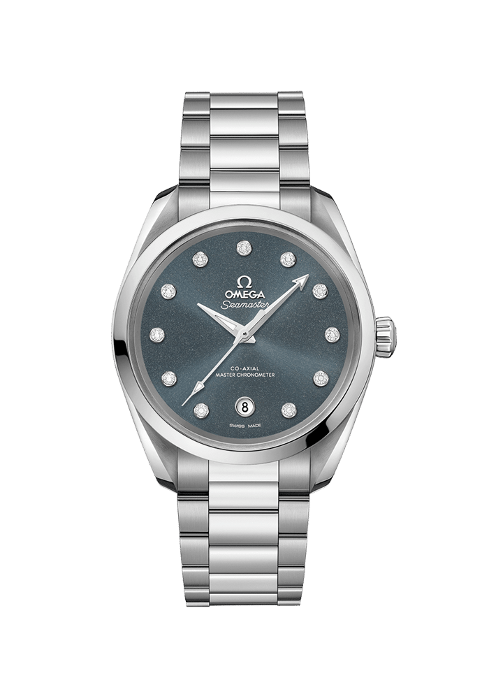 Dieses Modell mit einem symmetrischen 38-mm-Gehäuse aus Edelstahl verfügt über ein schimmerndes blau-graues Zifferblatt mit einem Datumsfenster bei 6 Uhr und 11 diamantbesetzten Indizes in rhodinierten Fassungen.