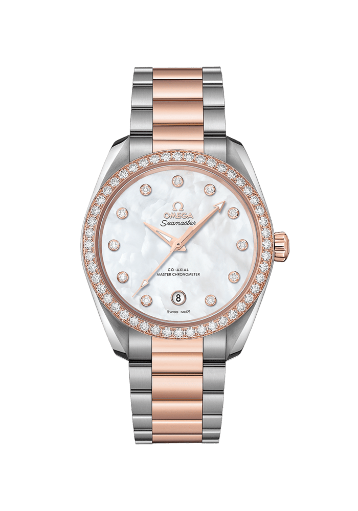 Die Lünette ist ebenfalls diamantbesetzt und die Uhr wird von einem integrierten Armband aus Edelstahl und 18 K Sedna™-Gold am Handgelenk gehalten. Angetrieben wird das Modell von dem OMEGA Co-Axial Master Chronometer Kaliber 8800, das vom Eidgenössischen Institut für Metrologie (METAS) zertifiziert wurde und höchsten Branchenstandards entspricht.