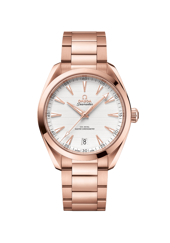 Die Seamaster Aqua Terra ist ein Tribut an OMEGAs großes maritimes Erbe. Das symmetrische Gehäuse dieses 41-mm-Modells besteht aus 18 K Sedna™-Gold und ist auf der Rückseite mit einem Wellendekor versehen.