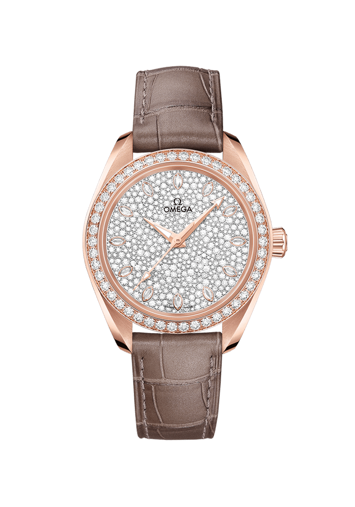 Diese außergewöhnliche Seamaster Aqua Terra, die aus verschiedenen edlen Materialien gefertigt wurde, ist eine Schmuckuhr von faszinierender Schönheit. Das 34-mm-Gehäuse mit diamantbesetzter Lünette besteht aus 18 K Sedna™-Gold. Das gleiche Gold wird auch für die Zeiger der Uhr verwendet. Während das funkelnde Zifferblatt mit 498 Diamanten unterschiedlicher Größe besetzt ist, gehören zu den Stundenindizes 12 Diamanten im Marquiseschliff. Die Uhr ist mit einem glänzend taupefarbenen Lederarmband ausgestattet und wird vom Master Chronometer-Kaliber 8807 angetrieben, das in puncto Präzision, Leistung und magnetischer Widerstandsfähigkeit den höchsten Branchenstandards entspricht.