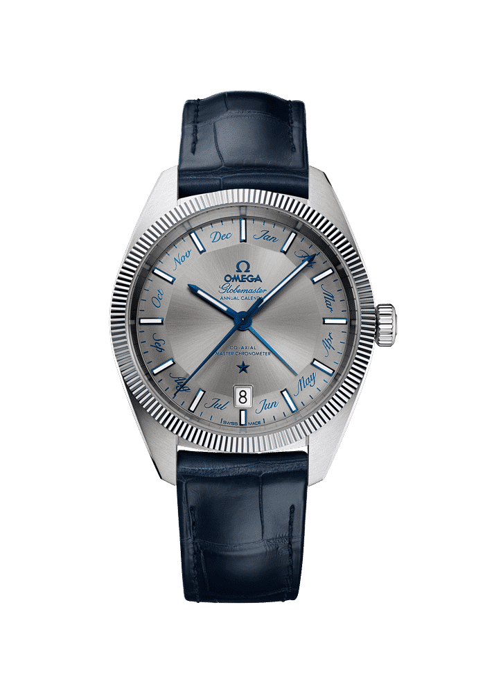 Die Uhr ist mit einem blauen Lederarmband ausgestattet und wird von OMEGAs Co-Axial Master Chronometer Annual Calendar-Kaliber 8922 mit revolutionärer antimagnetischer Technologie angetrieben.