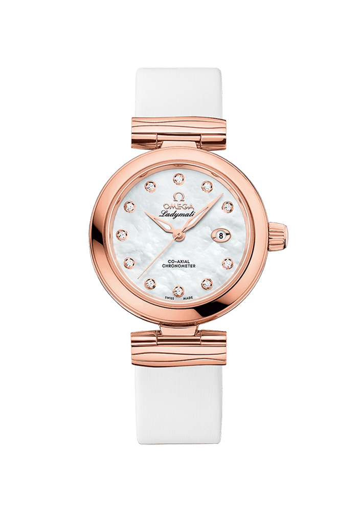 Bei diesem Modell bestehen sowohl das 34-mm-Gehäuse als auch die mit einem Wellendekor versehenen Befestigungsglieder des weißen Lederarmbands aus 18 K Sedna™-Gold, und auch die polierten alphaförmigen Zeiger sowie die 11 diamantbesetzten Indizes sind aus diesem eindrucksvollen Material gefertigt.