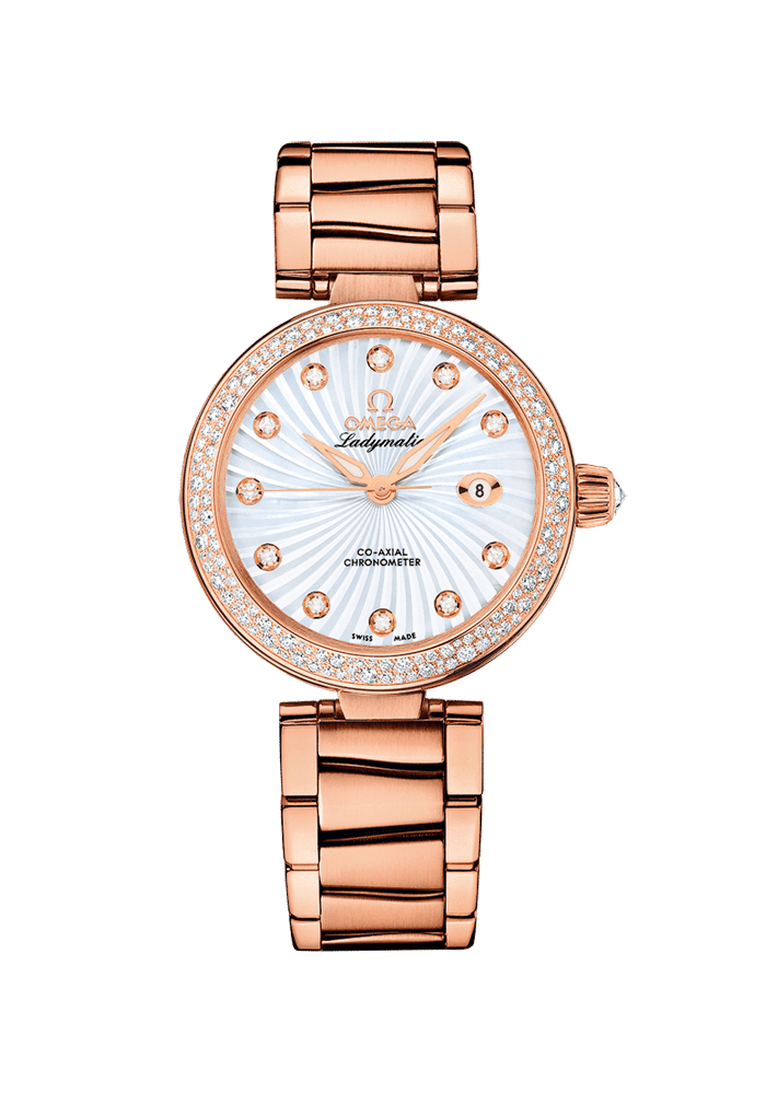 Diese OMEGA Ladymatic verfügt über ein weißes Perlmuttzifferblatt mit diamantbesetzten Indizes, Supernova-Dekor und Datumsfenster bei 3 Uhr. Das exklusive Zifferblatt ist durch das kratzresistente Saphirglas sichtbar. Die mit Diamanten unterschiedlicher Größe besetzte Lünette ist auf einem 34-mm-Gehäuse aus 18 K Rotgold mit passendem Armband aus 18 K Rotgold angebracht.