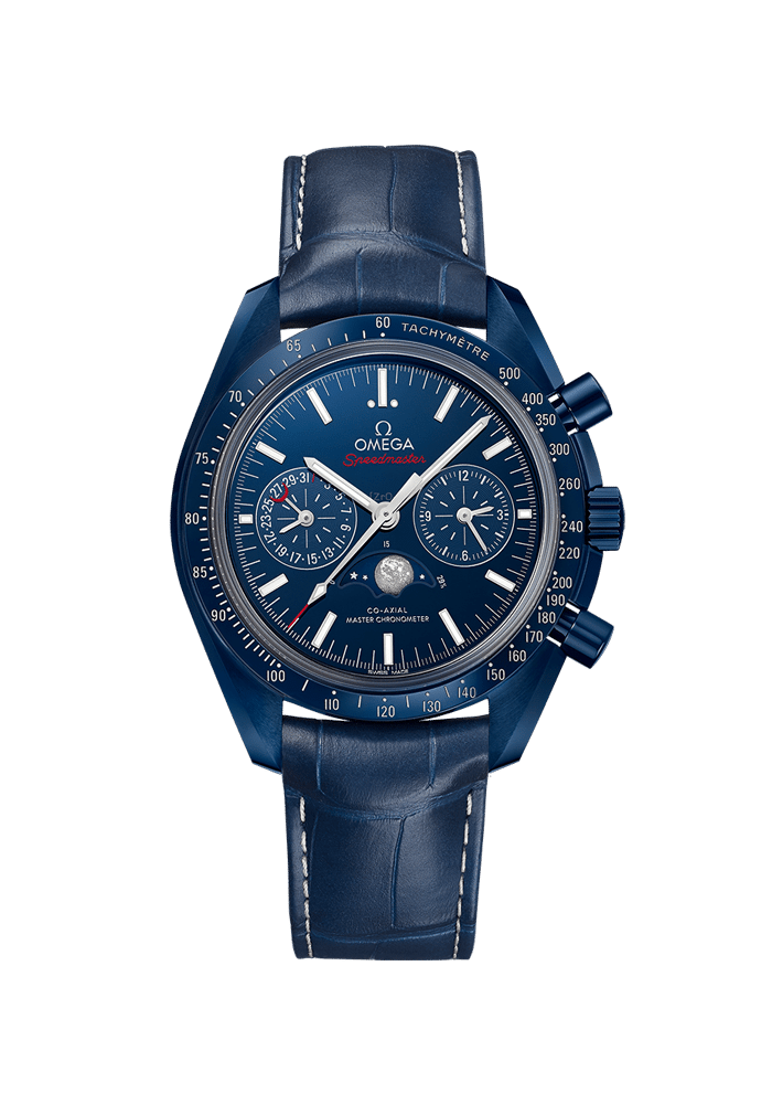 Die Speedmaster, die bei allen sechs Mondmissionen dabei war, gehört zu OMEGAs legendärsten Zeitmessern. In Anlehnung an diesen Forschergeist verweist der Name „Blue Side of the Moon“ auf die dunkelblaue Farbe des Himmels. Die Uhr verfügt über ein blaues Keramikgehäuse mit 44,25 mm Durchmesser, das von einem blauen Lünettenring aus Keramik mit Tachymeterskala aus Liquidmetal™ ergänzt wird. Sie wird von einem blauen Lederarmband mit Faltschließe aus blauer Keramik und keramisiertem Titan am Handgelenk gehalten. Das blaue Keramikzifferblatt ist mit Indizes und Zeigern aus 18 K Weißgold versehen. Bei 6 Uhr befindet sich die Mondphasenanzeige, die aus einer blauen Keramikscheibe besteht, auf der sowohl die erdzugewandte als auch die erdabgewandte Seite des Mondes aus Liquidmetal™ zu sehen ist. Angetrieben wird der Zeitmesser von OMEGAs Co-Axial Master Chronometer-Kaliber 9904, das offiziell von METAS zertifiziert wurde.