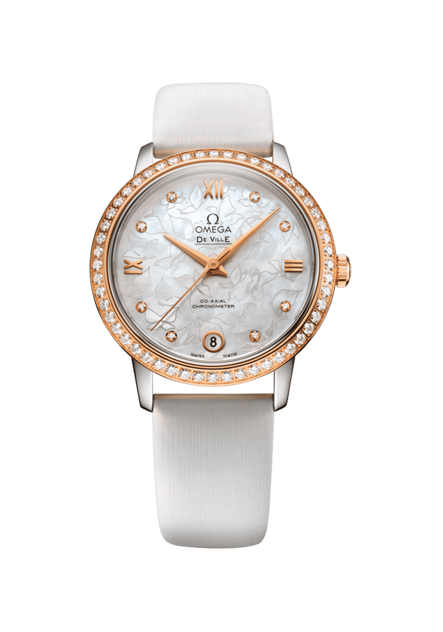 Die diamantbesetzte Lünette aus 18 K Rotgold ist auf einem 32,7-mm-Gehäuse aus Edelstahl mit weißem satiniertem Lederarmband angebracht. Das Herzstück dieser De Ville Prestige „Butterfly“ bildet das Co-Axial Kaliber 2500.