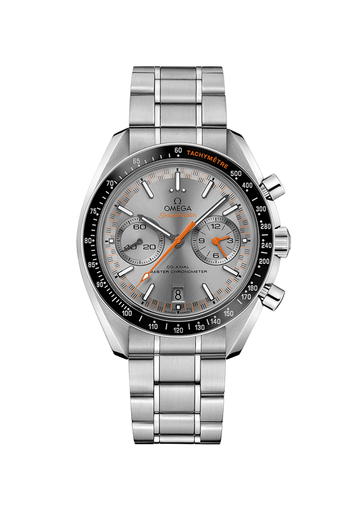 Dieses Speedmaster Racing Master Chronometer-Modell kennzeichnet ein 44,25-mm-Gehäuse aus Edelstahl mit Edelstahlarmband mit einem Lünettenring aus schwarzer Keramik, der mit der berühmten Tachymeterskala mit orangefarbenem Schriftzug und Ziffern aus Liquidmetal™ versehen ist.