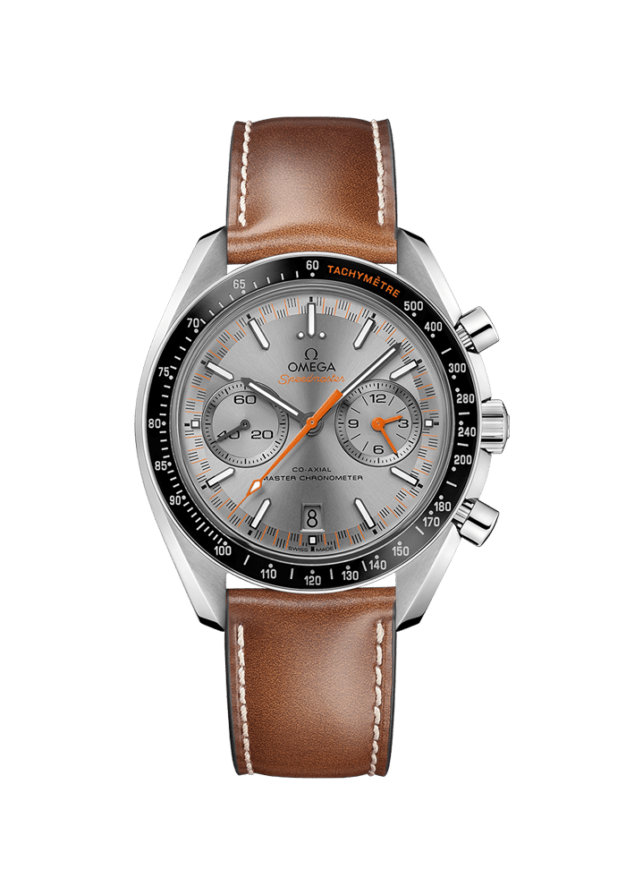Dieses Speedmaster Racing Master Chronometer-Modell kennzeichnet ein 44,25-mm-Gehäuse aus Edelstahl mit braunem Lederarmband und einem Lünettenring aus schwarzer Keramik, der mit der berühmten Tachymeterskala mit orangefarbenem Schriftzug und Ziffern aus Liquidmetal™ versehen ist.