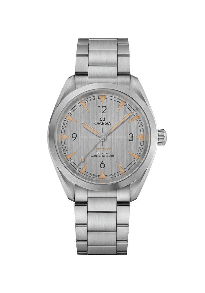 Das symmetrische Gehäuse des 40-mm-Modells besteht aus Edelstahl und ist auf der Rückseite mit einem Wellendekor versehen. Das vertikal gebürstete graue Zifferblatt verfügt über gebürstete Edelstahlzeiger? und vertiefte Stundenindizes, die mit „Vintage“-Super-LumiNova gefüllt sind. Es ist außerdem mit einem beigefarbenen „Railmaster“-Aufdruck versehen, das dem Design eine klassische Ästhetik verleiht.