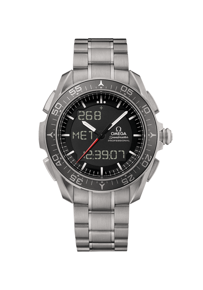 Dieser 45 mm große, aus Titan Grade 2 gefertigte Zeitmesser verfügt über einen schwarzen Keramiklünettenring, ein schwarzes Zifferblatt mit LCD-Display und ein Armband aus Titan Grade 2 und 5. Er ist mit OMEGAs Kaliber 5619, einem multifunktionalen Quarzchronographenwerk, ausgestattet.
