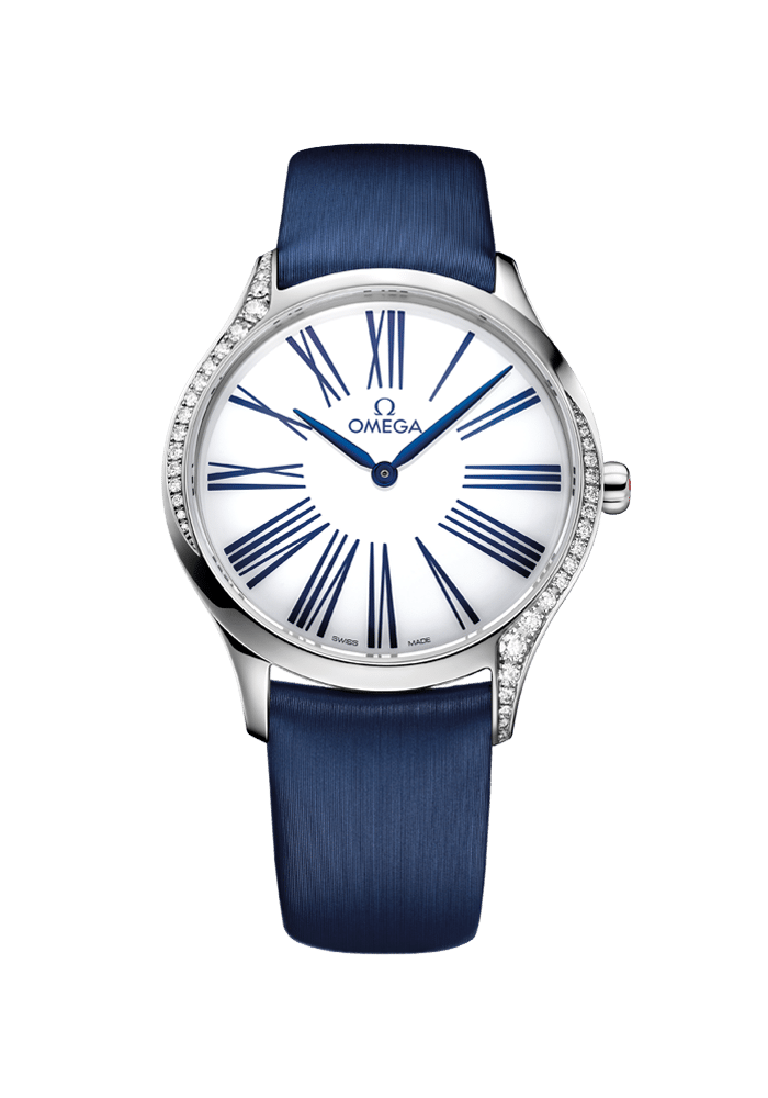 Das schlanke 36 mm große Gehäuse besteht aus Edelstahl und ist mit einem Diamantbesatz, der sich an den beiden äußeren Seiten an das Gehäuse schmiegt, sowie einer Krone, die mit roter „HyCeram“ poliert und mit einem Diamanten besetzt ist, versehen. Das weiß lackierte Zifferblatt verfügt über einzigartige versetzte römische Ziffern in Blau und elegante gebläute Zeiger.