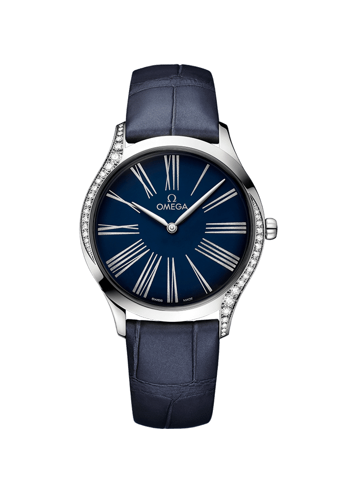 Das schlanke 36 mm große Gehäuse besteht aus Edelstahl und ist mit einem Diamantbesatz, der sich an den beiden äußeren Seiten an das Gehäuse schmiegt, sowie einer Krone, die mit roter „HyCeram“ poliert und mit einem Diamanten besetzt ist, versehen. Das blau lackierte Zifferblatt verfügt über einzigartige versetzte römische Ziffern und rhodinierte Zeiger.