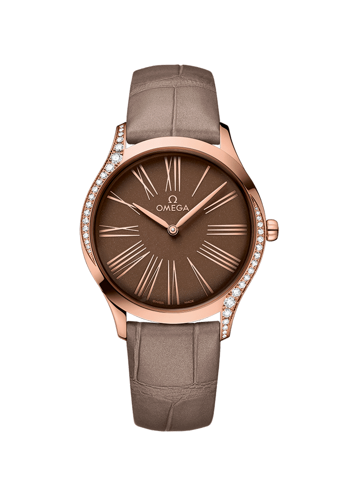 Die Uhr wird von OMEGAs Kaliber 4061 angetrieben, das sich hinter einem Gehäuseboden aus speziellem Glas mit „Time for Her“-Dekor befindet. Abgerundet wird das Ensemble durch ein taupebraunes Lederarmband.