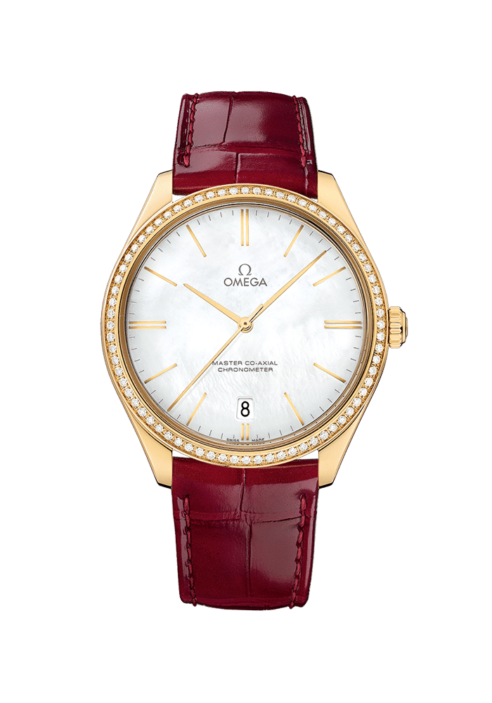 Dieses Modell verfügt über ein gewölbtes weißes Perlmuttzifferblatt mit polierten Zeigern aus 18 K Gold und einem Datumsfenster bei 6 Uhr. Das 40 mm große Gehäuse aus 18 K Gelbgold mit diamantbesetzter Lünette ist mit einem roten Lederarmband mit polierter Schließe versehen. Angetrieben wird diese De Ville Trésor von OMEGAs antimagnetischem Master Co-Axial Kaliber 8511, einem einzigartigen Uhrwerk mit Handaufzug.