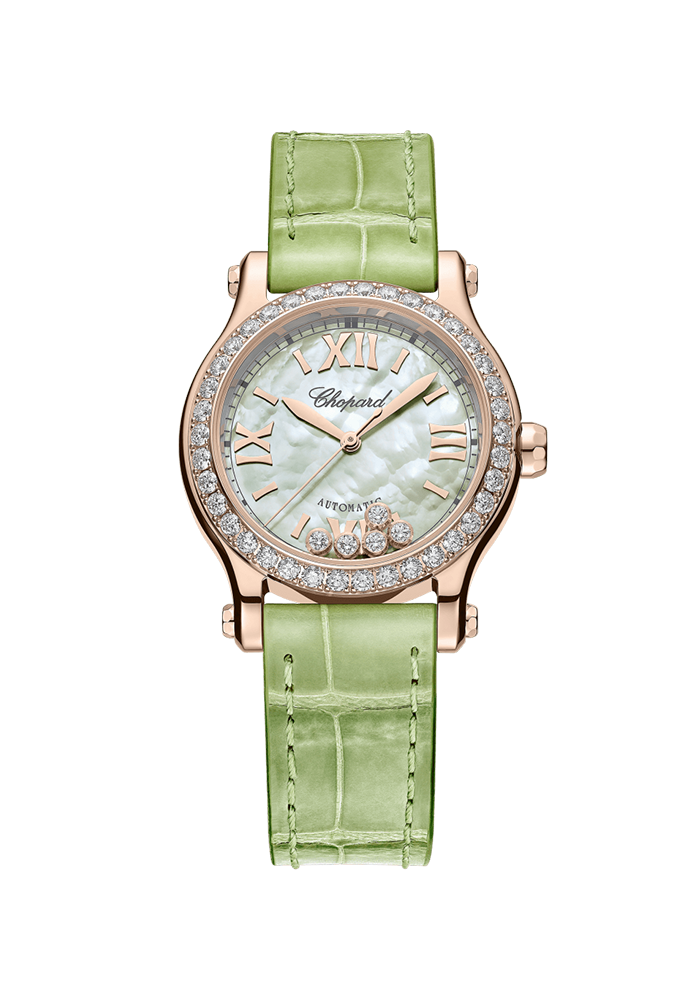 | Zifferblatt | Perlmutt-Perlen in Grün, weiße Diamanten |