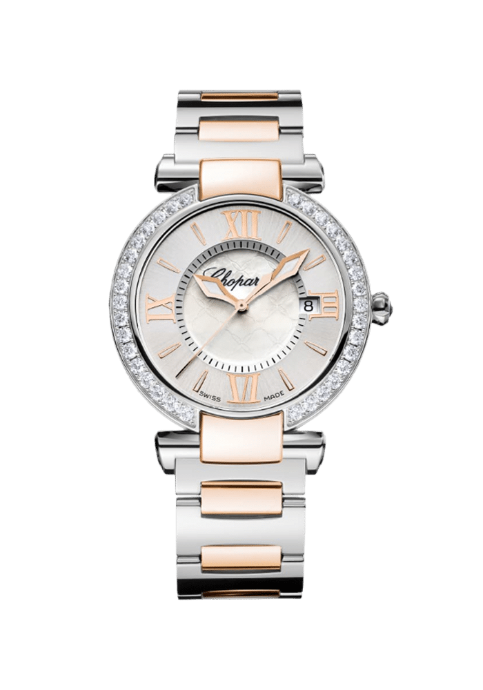 Die mit Diamanten besetzte Lünette dieser IMPERIALE in 18 Karat Roségold und Edelstahl mit passendem Armband verleiht ihrer geschwungenen Form einen eleganten Glanz. Auf dem silberfarbenen Zifferblatt geben die durch das Zeitalter der Weltreiche inspirierten, fein geschwungenen Zeiger und imperialen römischen Ziffern die Zeit an, während der edle Glanz des Amethyst-Cabochons auf der Krone an den kaiserlichen Purpur des byzantinischen Hofes erinnert.