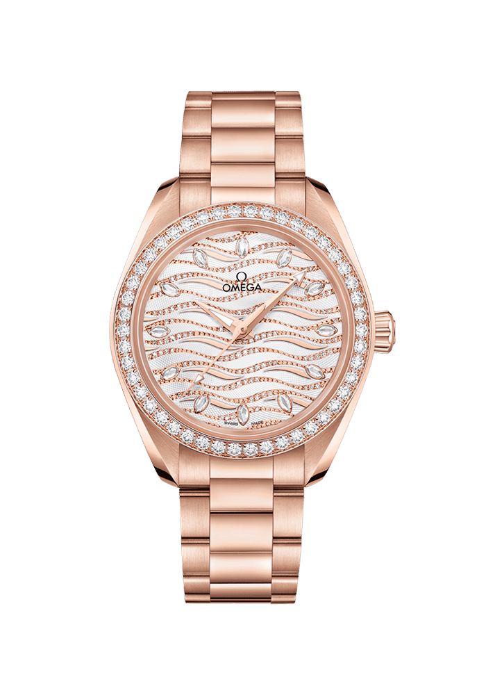 Diese außergewöhnliche Seamaster Aqua Terra, die aus verschiedenen edlen Materialien gefertigt wurde, ist eine Schmuckuhr von faszinierender Schönheit. Das 34-mm-Gehäuse mit diamantbesetzter Lünette besteht aus 18 K Sedna™-Gold. Das gleiche Gold wird auch für die Zeiger und das Armband der Uhr verwendet. Während das funkelnde Zifferblatt über ein aus 138 Diamanten gefertigtes Wellendekor verfügt, gehören zu den Stundenindizes 12 Diamanten im Marquiseschliff. Die Uhr wird vom Master Chronometer-Kaliber 8807 angetrieben, das in puncto Präzision, Leistung und magnetischer Widerstandsfähigkeit den höchsten Branchenstandards entspricht.