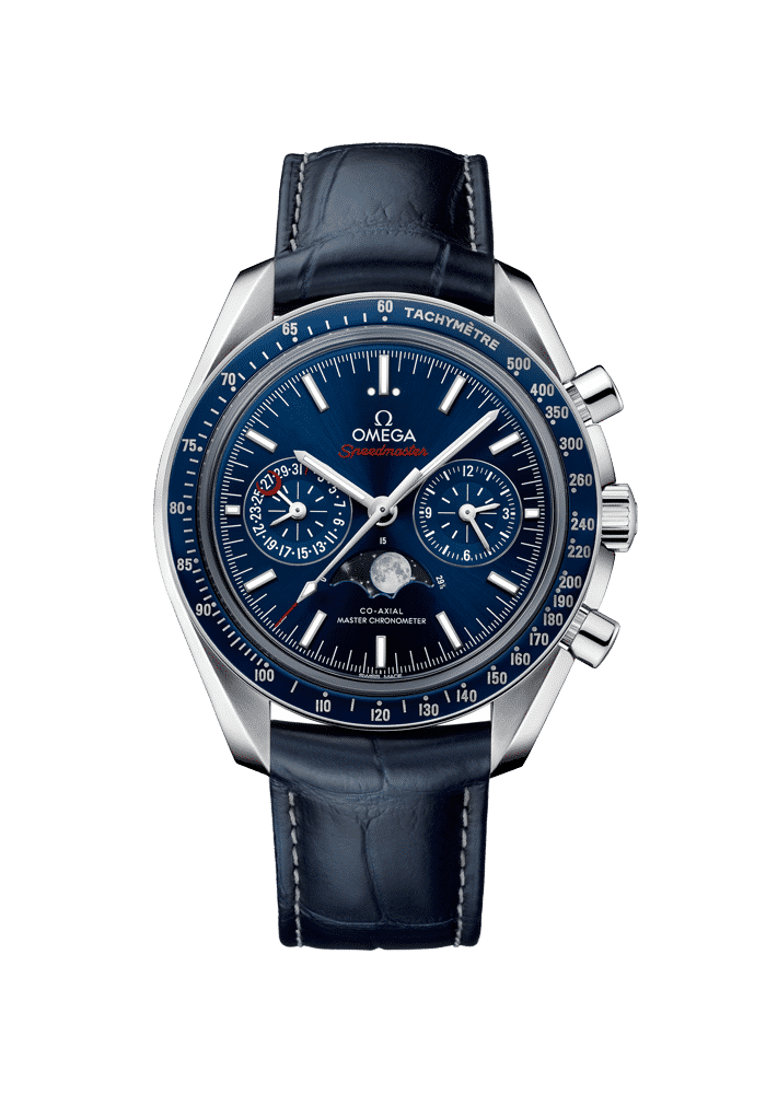 Dieses 44,25 mm große Modell wartet mit einem blauen Zifferblatt mit Sonnenschliff und rhodinierten Indizes auf. Bei 6 Uhr findet sich die präzise Mondphasenanzeige, die durch eine mikrostrukturierte metallische Kristallscheibe, die eine hochauflösende Darstellung des Mondes bietet, besticht.
