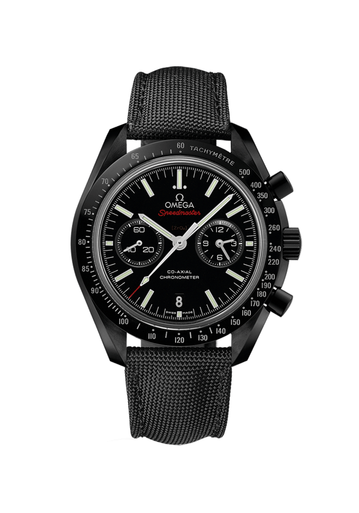 Diese robust wirkende Version der Moonwatch „Dark Side of the Moon“ kommt tief aus dem All. Das in einem Stück aus schwarzer Keramik gefertigte charakteristische 44,25-mm-Speedmaster-Gehäuse wird durch eine gebürstete Keramiklünette mit matter Chromnitrid-Tachymeterskala abgerundet.