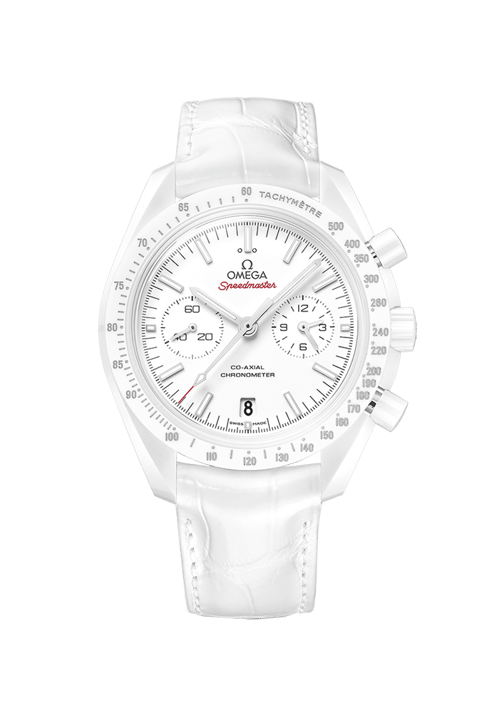 Das Zifferblatt im „Moonwatch“-Stil mit zwei Zählern bei 3 und 9 Uhr besteht ebenfalls aus weißer Keramik und ist mit applizierten Indizes aus glänzendem 18 K Weißgold versehen.