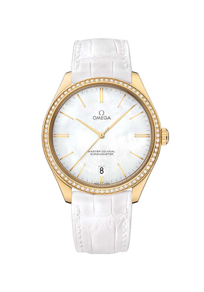 Die sich durch ein flaches Gehäuse aus klassischem Gold auszeichnende Trésor-Linie wurde erstmalig 1949 – mit dem legendären 30-mm-Kaliber im Inneren – lanciert. Mehr als 50 Jahre später haucht OMEGA der nunmehr von einem der fortschrittlichsten mechanischen Uhrwerke, das je von der Marke herausgebracht wurde, angetriebenen De Ville Trésor neues Leben ein. Dieses Modell verfügt über ein gewölbtes weißes Perlmuttzifferblatt mit polierten Zeigern aus 18 K Gold und einem Datumsfenster bei 6 Uhr. Das 40 mm große Gehäuse aus 18 K Gelbgold mit diamantbesetzter Lünette ist mit einem weißen Lederarmband mit polierter Schließe versehen. Angetrieben wird diese De Ville Trésor von OMEGAs antimagnetischem Master Co-Axial Kaliber 8511, einem einzigartigen Uhrwerk mit Handaufzug.