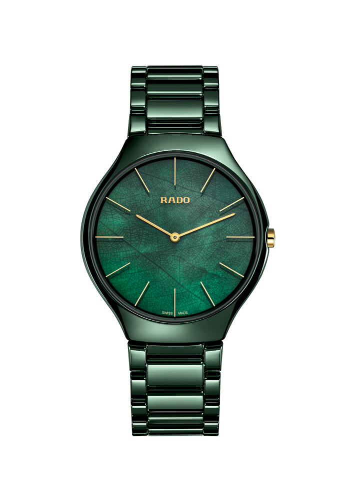 Die True Thinline Nature Kollektion ist von der Natur und Rados Partnerschaft mit Grandi Giardini Italiani inspiriert. Sie vereint das Beste der True Thinline Kollektion. Die drei Modelle sind in den drei Farben aus dem Logo der Grandi Giardini Italiani gestaltet. Mit ihren innovativen Zifferblattgestaltungen stehen die drei Varianten für Erde, Wasser und Blätter.
